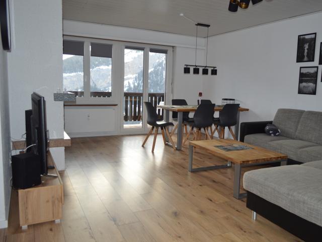 Wohnraum mit ausziehbarem Sofa, offene Küche mit Geschirrspüler, 1 Schlafzimmer mit 2 Betten, 1 kleines Zimmer (ohne Fenster) mit Stockbett, Dusche/WC, Kamin, Radio, Fernseher, Garagenplatz, Südbalkon