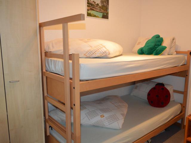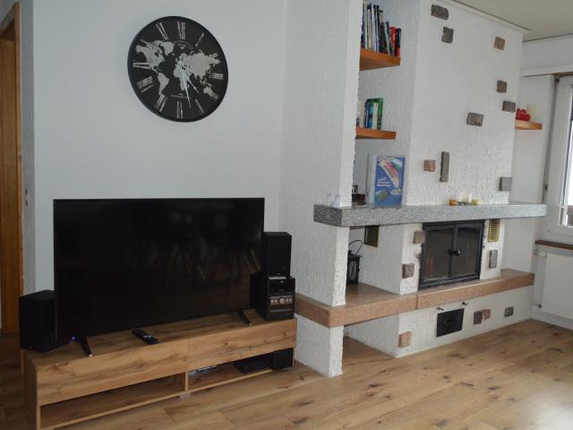 Wohnraum mit ausziehbarem Sofa, offene Küche mit Geschirrspüler, 1 Schlafzimmer mit 2 Betten, 1 kleines Zimmer (ohne Fenster) mit Stockbett, Dusche/WC, Kamin, Radio, Fernseher, Garagenplatz, Südbalkon