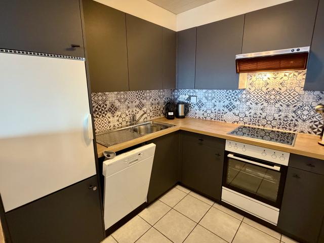 Wohnraum mit ausziehbarem Sofa, offene Küche mit Geschirrspüler, 1 Schlafzimmer mit 2 Betten, 1 kleines Zimmer (ohne Fenster) mit Stockbett, Dusche/WC, Kamin, Radio, Fernseher, Garagenplatz, Südbalkon